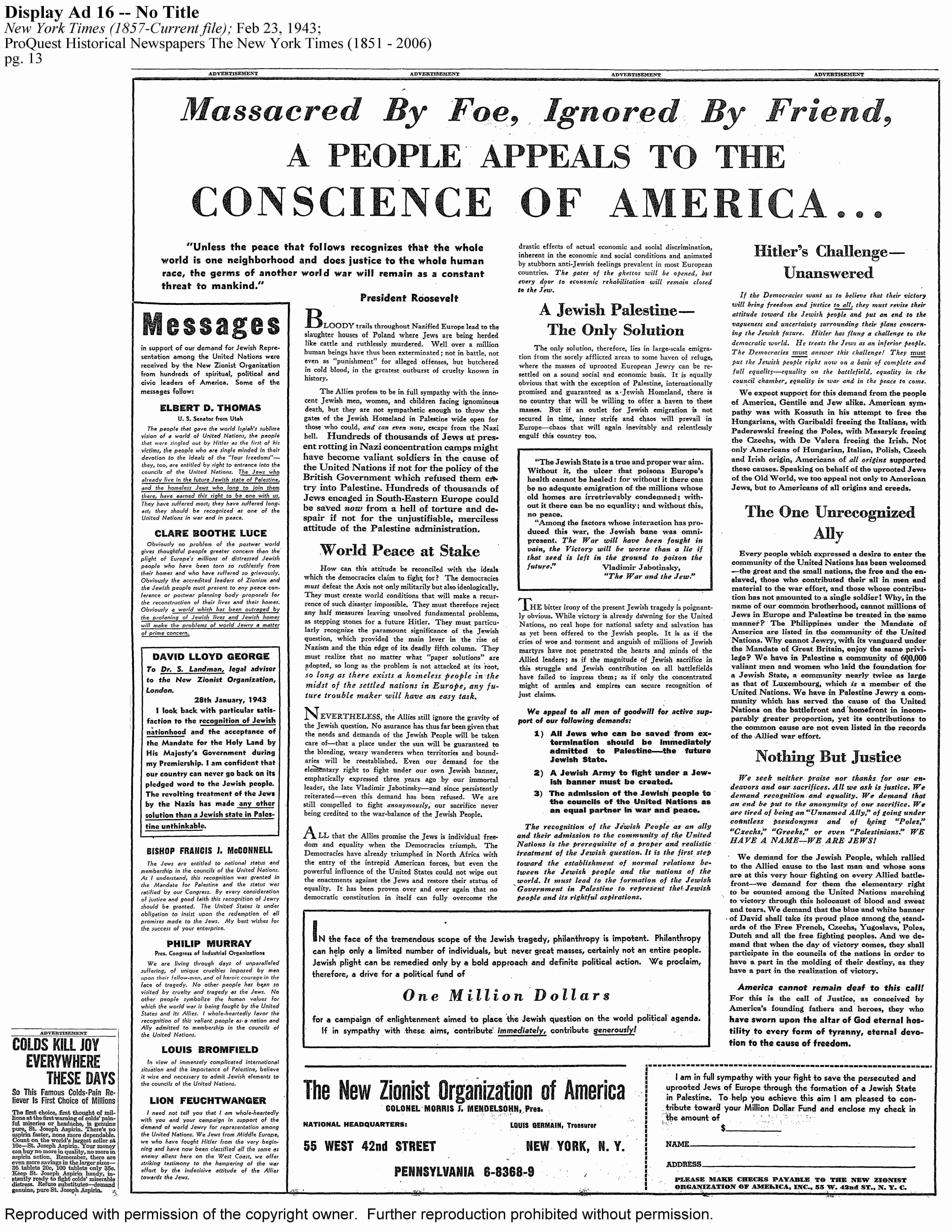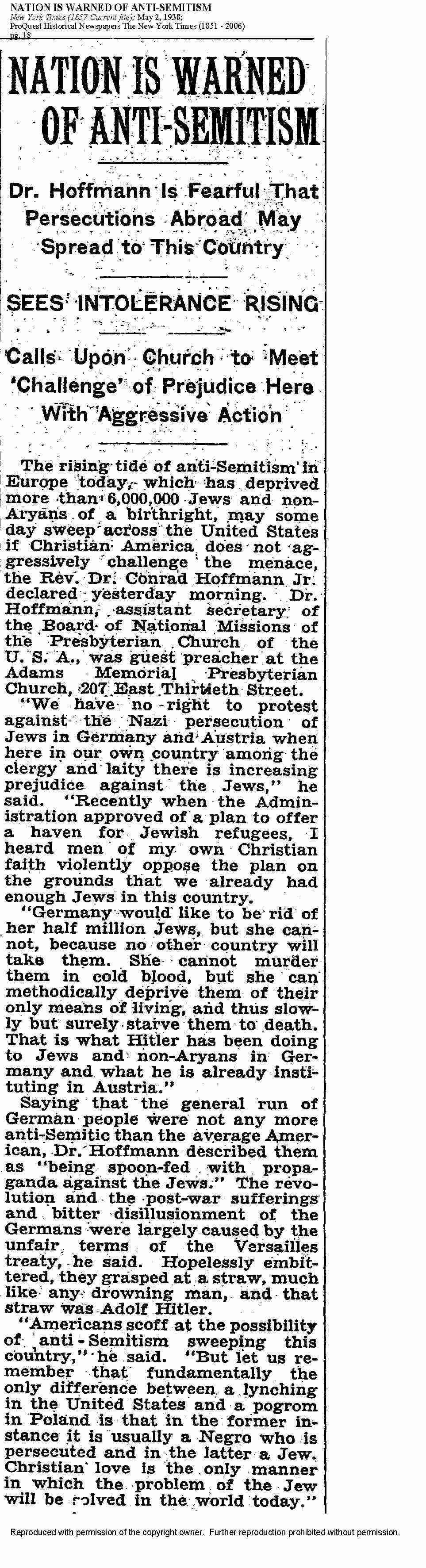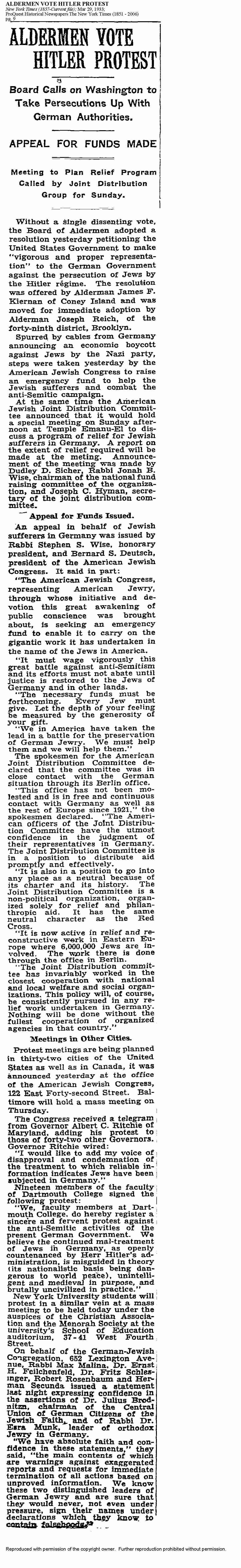 - "The rising tide of anti-Semitism in Europe today, which has deprived more than 6,000,000 Jew and non-Aryans of a birthright, may someday sweep across the United States..."