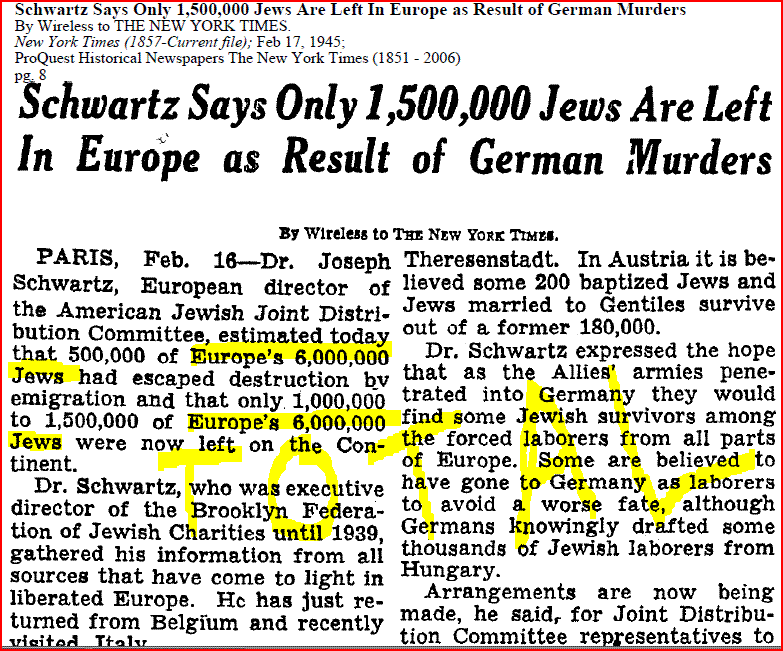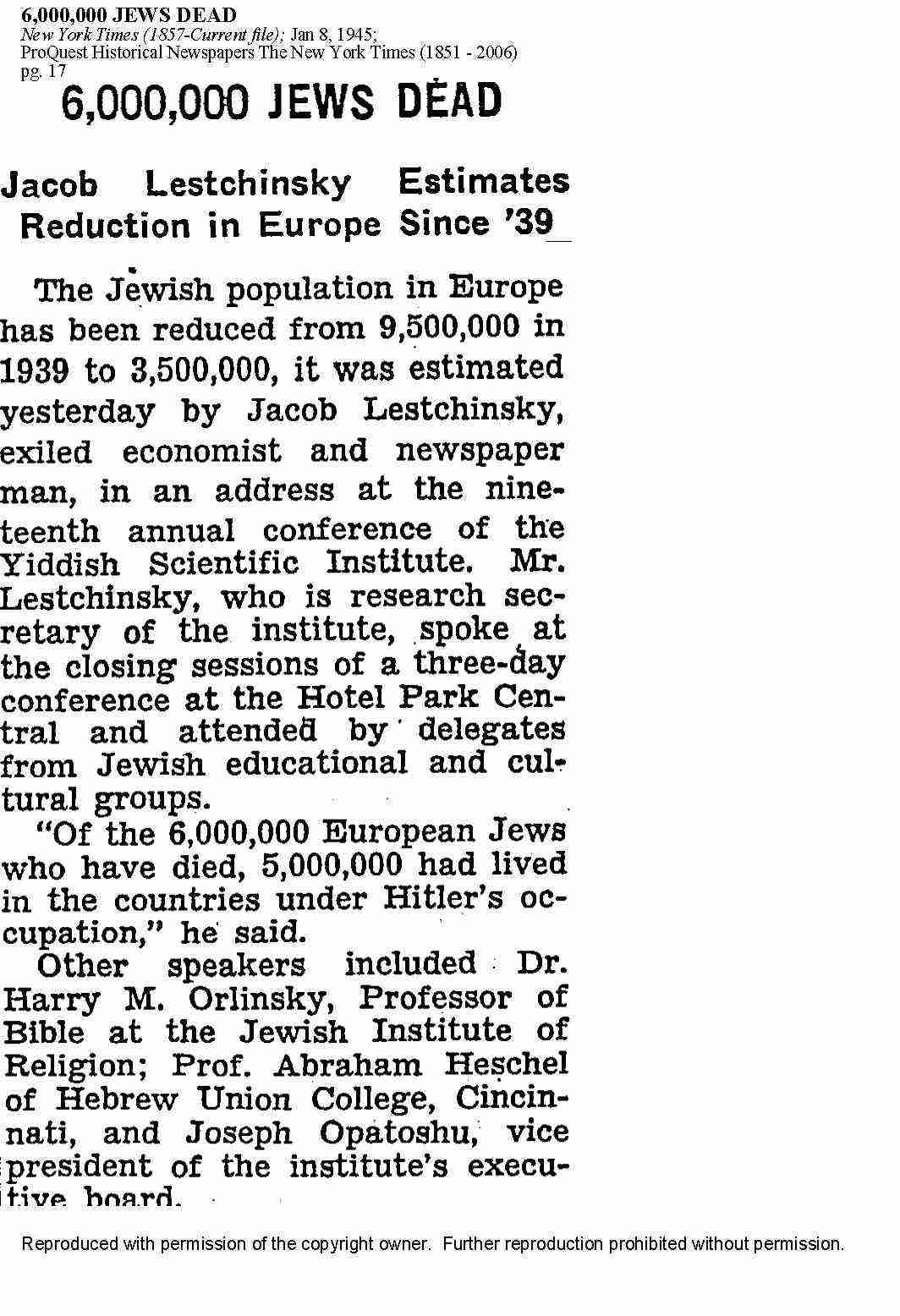 - Note the claim of "6,000,000 jews Dead" by Jewish activist Jacob Lestchinsky BEFORE the end of the war!