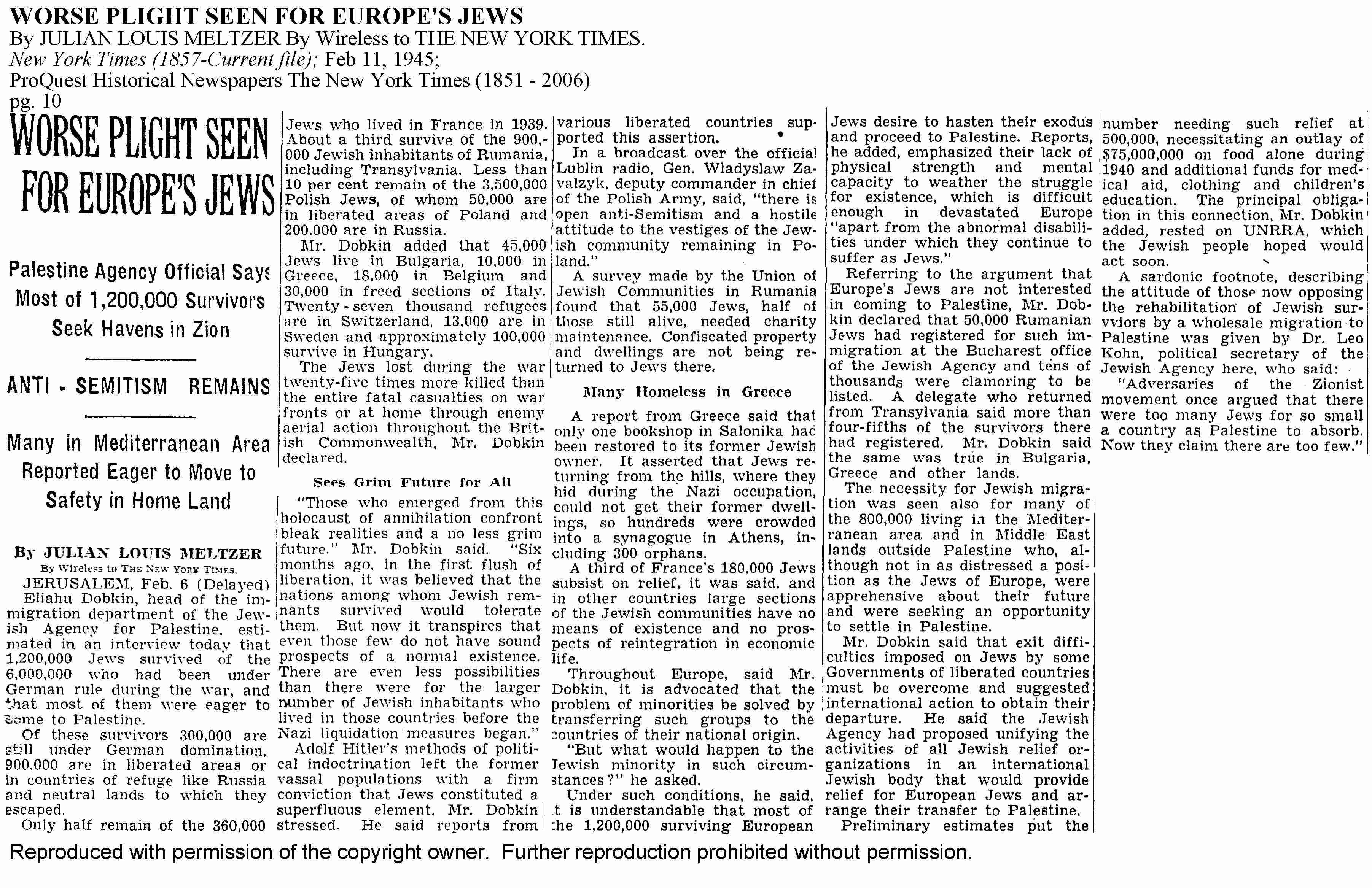 - "American Jewish Joint Distribution Committee, estimated today that 500,000 of Europe's 6,000,000 jews had escaped destruction by emigration and that only 1,000,000 to 1,500,000 of Europe's 6,000,000 jews were now left on the Continent."
