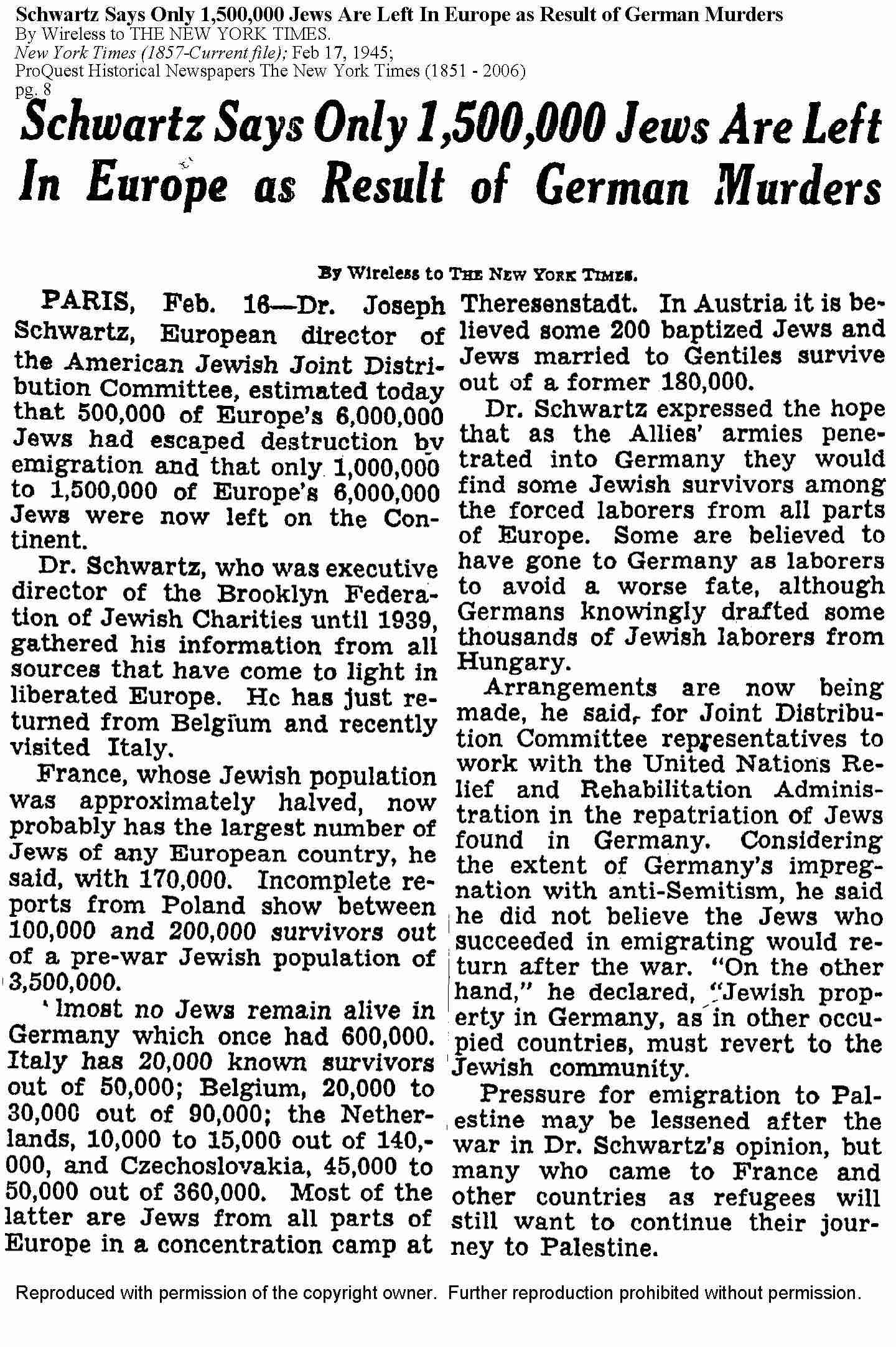 - Schwartz Says Only 1,500,000 jews are Left in Europe as Result of German Murders