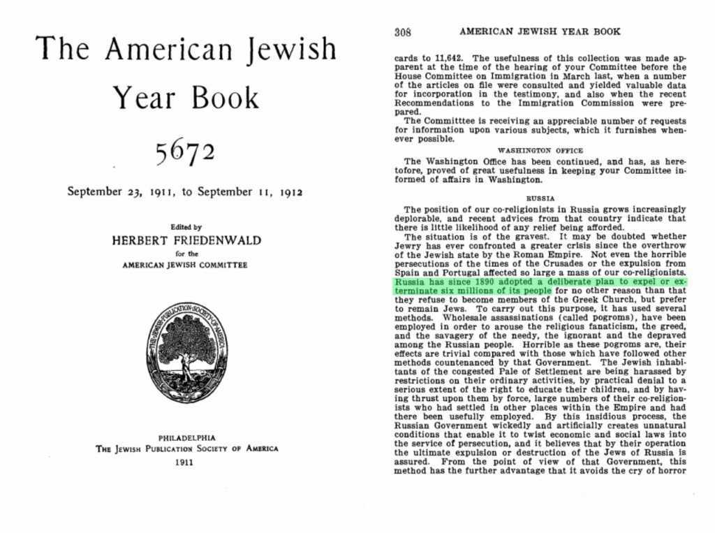 In the American Jewish Committee’s annual report it is claimed that since 1890 Russia has had a policy to “expel or exterminate” Six Million Jews. (Source: American Jewish Yearbook pg. 15)