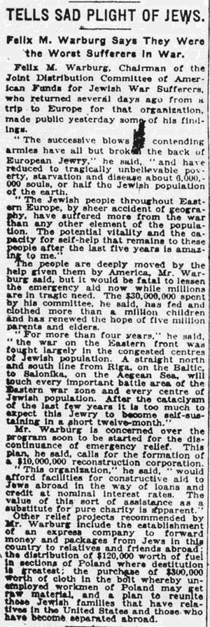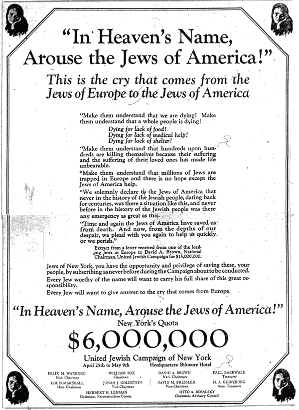 "From across the sea, six million men and women call to us for help [...] six million human beings. [...] Six million men and women are dying [...] in the threatened holocaust of human life [...] six million famished men and women. Six million men and women are dying [...]" The American Hebrew, Oct. 31, 1919, pp. 582f.