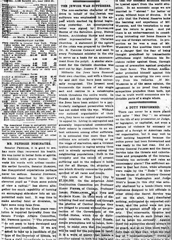 New York Times, May 3, 1920, Editorial, p. 12
