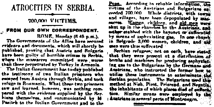 "According to reliable information, the victims of the Austrians and Bulgarians exceeded 700,000. [...] Women, children, and old men were shut up in the churches by the Austrians, and either stabbed with bayonet or suffocated by means of asphyxiating gas." The Daily Telegraph, March 22, 1916, p. 7