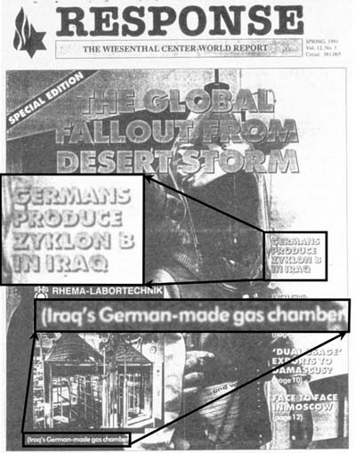 "Germans produce Zyklon B in Iraq [...] (Iraq's German-made gas chamber)" Response, Vol. 12, No. 1, Spring 1991