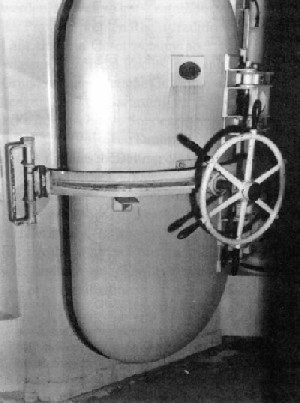 Fig. 5: Single door to an execution gas chamber for one single person per gassing procedure (Baltimore, USA, 1954, technology from the 1930s). The execution of a single person with hydrogen cyanide is inevitably far more complicated and dangerous to the environment than the fumigation of clothing (even in a DEGESCH circulation chamber). |