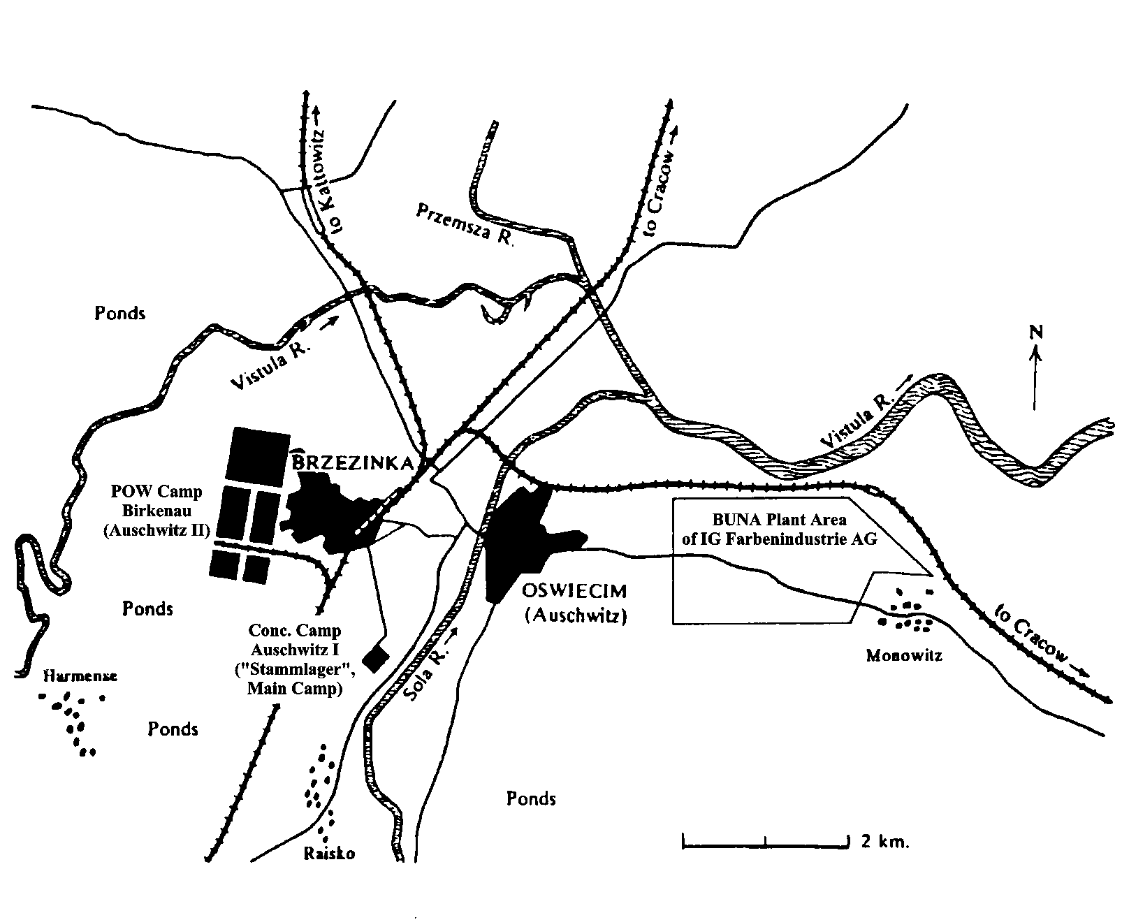 Fig. 10: Map of the surrounding vicinity of Auschwitz during the Second World War. The boundary lines of the terrain of the IG Farbenindustrie factories were entered later, and are only an approximate indication of the factory terrain. The terrain of Birkenau concentration camp corresponds to the planning situation of 1945, which was, in fact, never completed. |