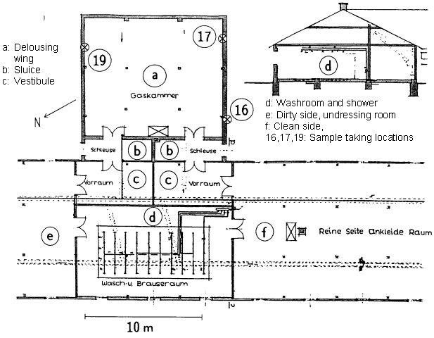 It was not uncommon for a crematorium to be installed in the same building complex, as may still be seen at Dachau concentration camp today (near Munich), in which the new hygienic installation possesses a series of DEGESCH circulating air installations for the disinfestation of clothing, with an undressing and redressing room to the right and left of the inmate showers, as well as a crematorium. (The room described as a "gas chamber" at Dachau today is actually the inmate shower, which is indispensable in the above schema, and which has been intentionally mislabeled by the Museum.)