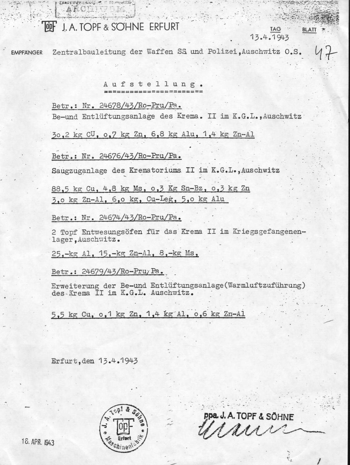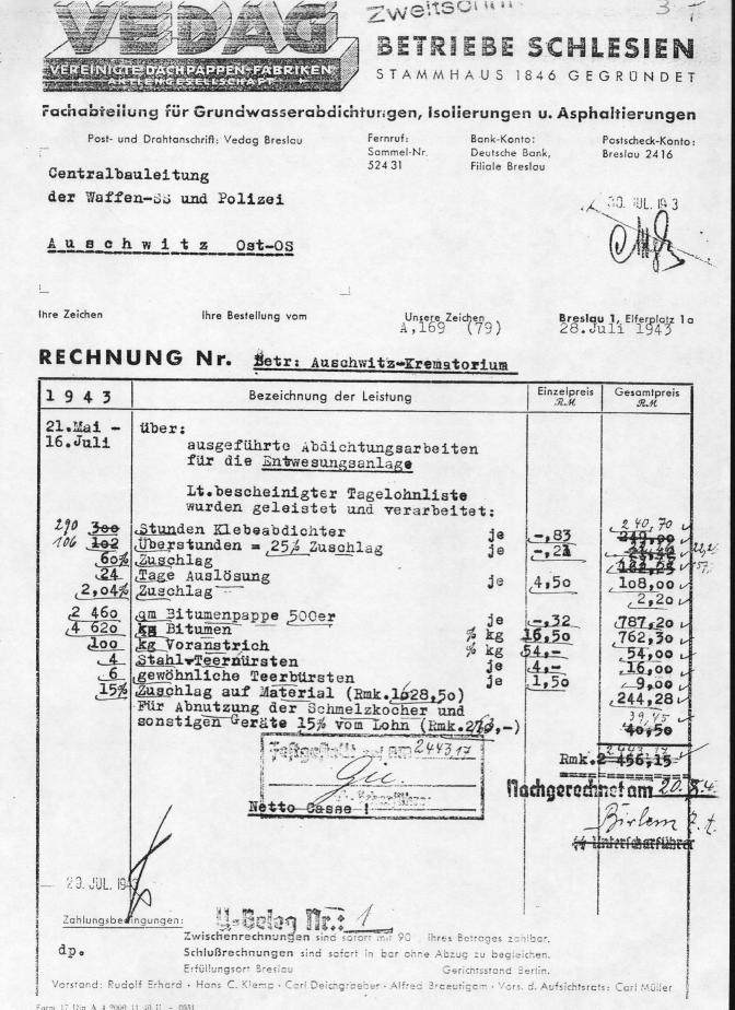 [219] | Invoice no. 729 dated May 27, 1943. APMO, D-Z/Bau, nr. inw. 1967, pp. 246f.; ibid., 231f.: invoice no. 171 dated 22. February 1943 for crematorium II. |