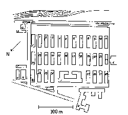 Fig. 12: Map of POW camp Auschwitz II/Birkenau, approximately 2 km north-west of the main camp, construction situation as of the end of 1944. The shaded buildings still exist, some of them, however, only in the form of ruins or foundations (crematoria II-V), the rest having been torn down by Polish civilians for building materials after the war. According to the information brochure of the Auschwitz State Museum, 1991. |