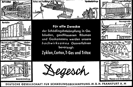 Fig. 16: Typical advertisement of the firm DEGESCH about the broad variety of applications of gassing methods offered: Flour mills, ships, stores, grain storages, houses, railroad cars, trucks.[131] |