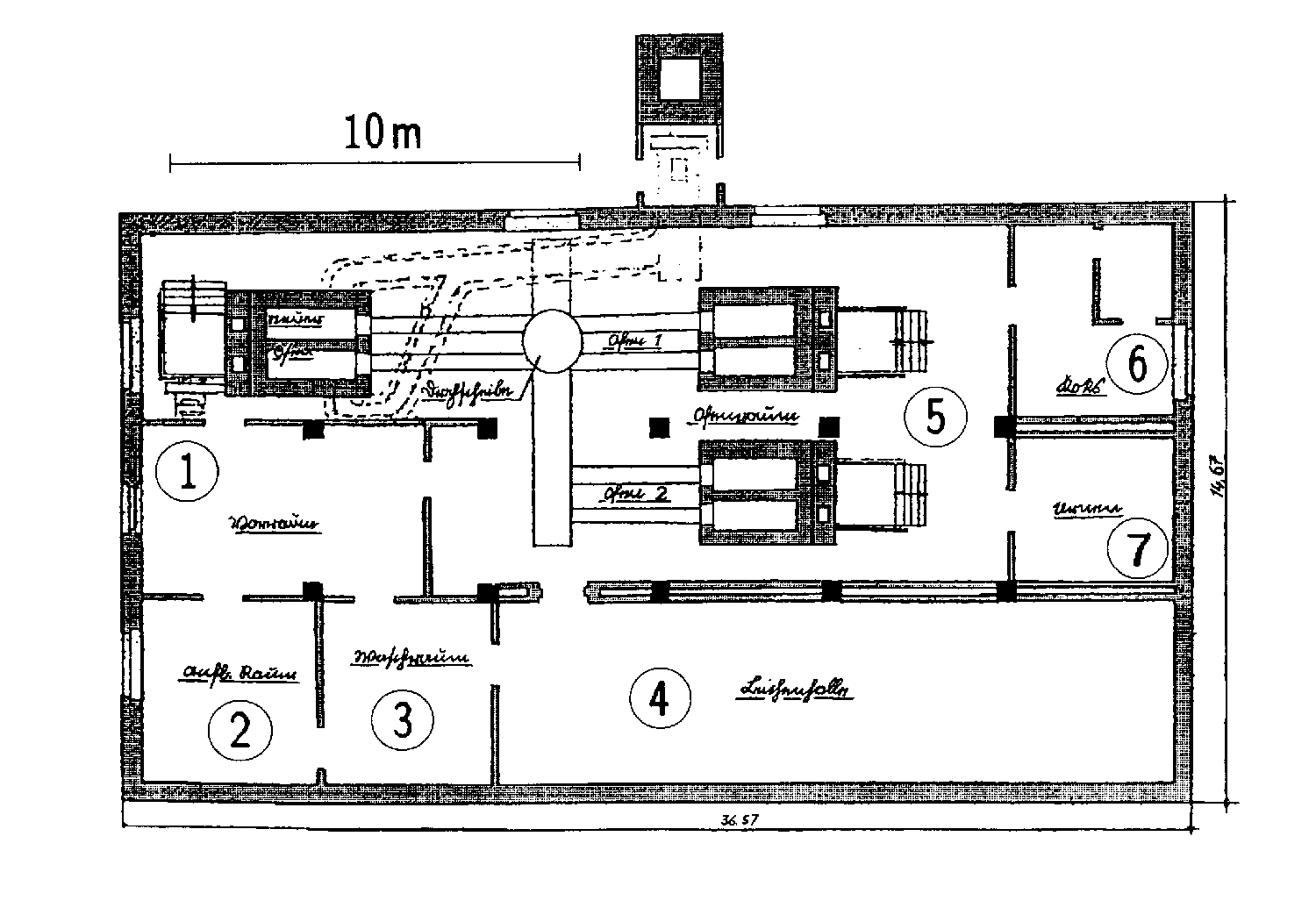 [220] | The engines had a nominal output of 2 HP (approximately 1.5 KW). The output data relate to a back-pressure of 40 mm water column. The increment calculations for estimating the ventilation shaft resistances in crematoria II & III according to engineering handbooks have shown that the back pressure to be expected would probably have been higher (in the region of 50-60 mm water columns), due, particularly, to the primitive lids with many small holes covering the ventilation slit. Two blowers were probably used for this reason. Personal communication from Hans Lamker, a certified engineer. |
