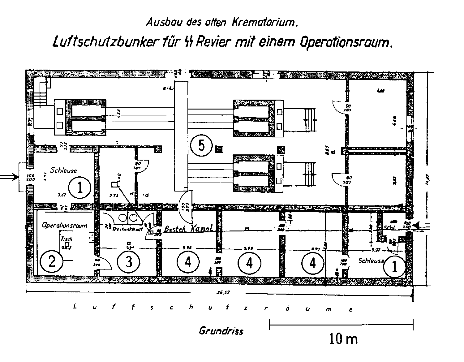 On May 7, 1943, in a discussion with the chief of Amtsgruppe C, SS Brigadier General and Major General of the Waffen-SS engineer Dr. Kammler, and others, the garrison physician set out in chapter "II. Bauten in Zuständigkeit des Standortarztes" (II. Buildings Under the Charge of the Garrison Physician):[146]