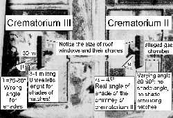[252] | The manipulations on this picture are overly plentiful, such as, for example, an interpolated drawing of a group of inmates allegedly marching over the roof of a barracks! See also J.C. Ball, ibid., p. 42; Ball, "Air Photo Evidence" in: Ernst Gauss (ed.), op. cit. (note 22), pp. 271-284 (online: www.vho.org/GB/Books/dth/fndaerial.html). On the alleged original photographs, it may furthermore be seen that the spots on morgues 1 of both crematoria (II + III) are pointing in different directions; ibid. private communication by J.C. Ball. |