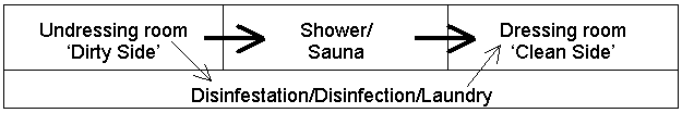 Fig. 15: Schematic organization of a hygiene complexà Clothing pathway; è Inmate pathway |