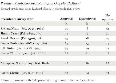about a month in office extends from 55% for Ronald Reagan to 71% for