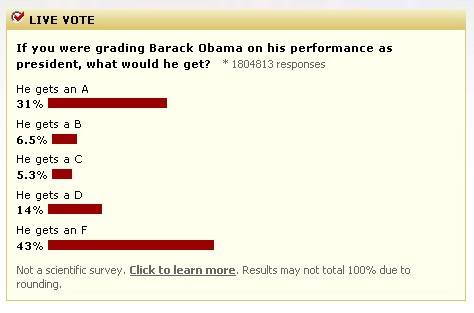 With more than 1.8 million responses to a MSNBC poll, Obama has earned a grade of "F" for his performance in office.