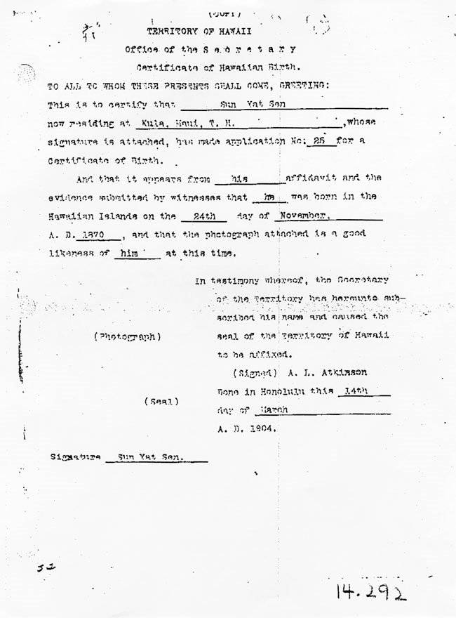 see a large copy of a beautifully printed Certificate of Hawaiian Birth