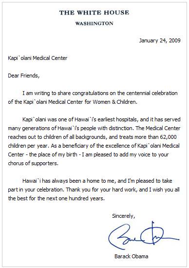 Obama wrote, "As a beneficiary of the excellence of Kapi'olani Medical
