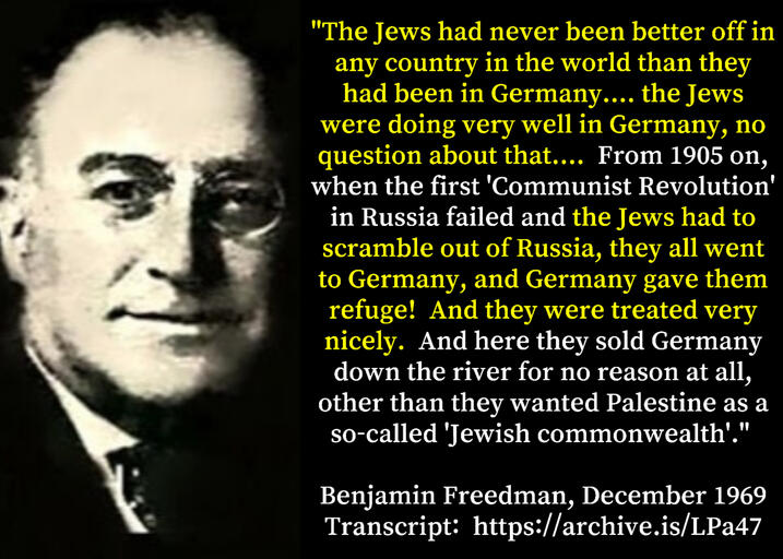 (Click for Embedded Audio Stream - Notes)Benjamin Harrison Freedman [Friedman] was one of the most intriguing and amazing individuals of the 20th century. Born in 1890, he was a successful businessman of New York City at one time principal owner of the Woodbury Soap Company. He broke with organized Jewry after the Judeo-Communist victory of 1945, and spent the remainder of his life and the great preponderance of his considerable fortune, at least 2.5 million dollars, exposing the Jewish tyranny which has enveloped the United States.