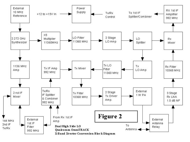 The previously published1 Qualcomm X-band conversion project required considerable mechanical as well as electrical modifications and was based on replacing the original stripline filters with pipecap filters. The pipecap filters were required to provide sufficient LO and image rejection at 10 GHz which the original stripline filters could not provide for a two meter IF. This version uses a somewhat smaller, more recent OmniTracks unit which contains the power supply and synthesizer on the same assembly as the RF board and utilizes dual-conversion high-side LO to allow use of the stripline filters. The filter modification has been proven to work well by extending the filter elements to specified lengths. Some additional tuning of the TX output stages appears to be required for maximum output.