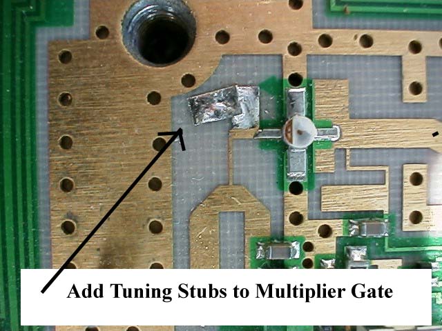 A section on the modification of the x5 multiplier stage was inadvertently omitted from the article. This stage is located directly to the left of the LO filter which is shown in Figure 5 of the article on page 133 of the Microwave Update '99 Proceedings. The gate of the x5 multiplier stage requires addition of two stripline stubs, as shown in the following photo. Lack of this modification results in inadequate LO drive to the transverter TX and Rx mixers causing low TX output and poor RX performance, as reported by several amateurs who have followed the original article.