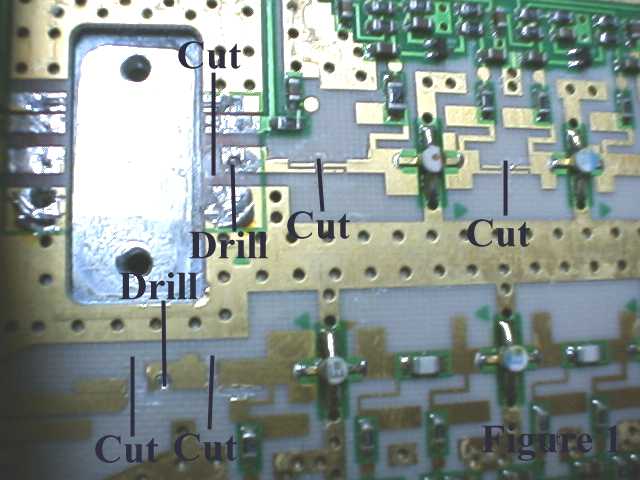 Before removing the boards from the baseplate, Carefully drill through the board in the two places shown using a 0.050-inch diameter drill just deep enough to mark the baseplate. These are the locations for the RX & TX RF SMA connectors. The upper-connector hole (TX) is located 0.5 inches to the left of the transistor case edge. The lower hole (RX) is located 0.4 inches to the left of the transistor case edge. Make the cuts as shown in Figure 1 using a sharp Exacto knife.