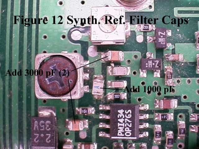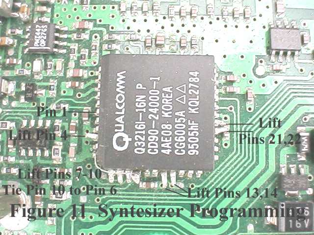 Figure 109. Program the synthesizer as shown in Figure 11 by carefully lifting the pins shown with an Exacto knife. Ground pin-10 connecting it to pin-6 which is ground. Add the two 3,000 pF and 1,000 pF in parallel with the existing reference filter capacitors as shown in Figure 12.