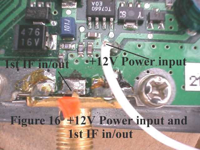 Figure 1513. The +12 VDC power input is connected to the point as shown in Figure 16. The original air core coil with one end connected to that point has been removed from the board. (This choke was originally used to supply +12 VDC to the transverter through the 1st IF port.)