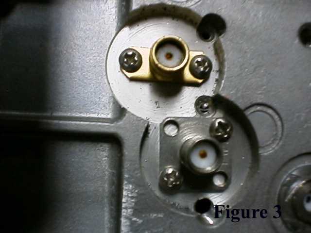 After making the holes and cuts, remove all screws and lift the boards off of the baseplate. (Note: The original antenna connector pin must be desoldered to remove the board.) Once the boards are removed, drill through the plate in the two locations marked using a 0.161-inch drill to clear the Teflon insulator of the SMA connectors. Use a milling tool to remove enough material on the back side of the baseplate (see Figure 3) to clear the two SMA connector locations, taking the thickness down to about 0.125 inches (may vary depending on available SMA connector pin length). Locate, drill and tap the baseplate for two #2-56 mounting screws at each connector. Mount the SMA connectors on the baseplate and cut the Teflon insulator flush with the top-side of the baseplate (circuit board side). Carefully clear the ground plane around the two connector holes on the bottom side of the circuit board to prevent the SMA probe from being shorted (using about a 0.125-inch drill rotated between your fingers). Reinstall the circuit boards onto the baseplate.
