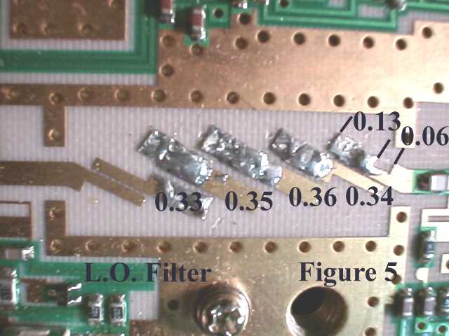 4. Extend the TX LO filter elements to the total length shown in Figure 4. Filter extensions are made by cutting 0.003 to 0.005-inch copper shim stock into strips about 0.07-inch wide and tinning both sides of the strip shaking off excess solder. No additional solder is normally needed when attaching the extensions as the tinning reflows when touched by the soldering iron. The length of the top element (0.21-inch) is measured between the marks as shown.