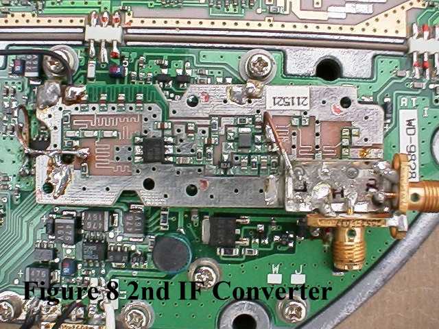 The second conversion stage consists of a second LO amplifier (1136 MHz) and SRA-11 mixer converting the 992 MHz 1st IF to the 144 2nd IF. A 992 MHz filter is required between two conversion stages. Both Evanescent mode and coaxial ceramic filters have been used.