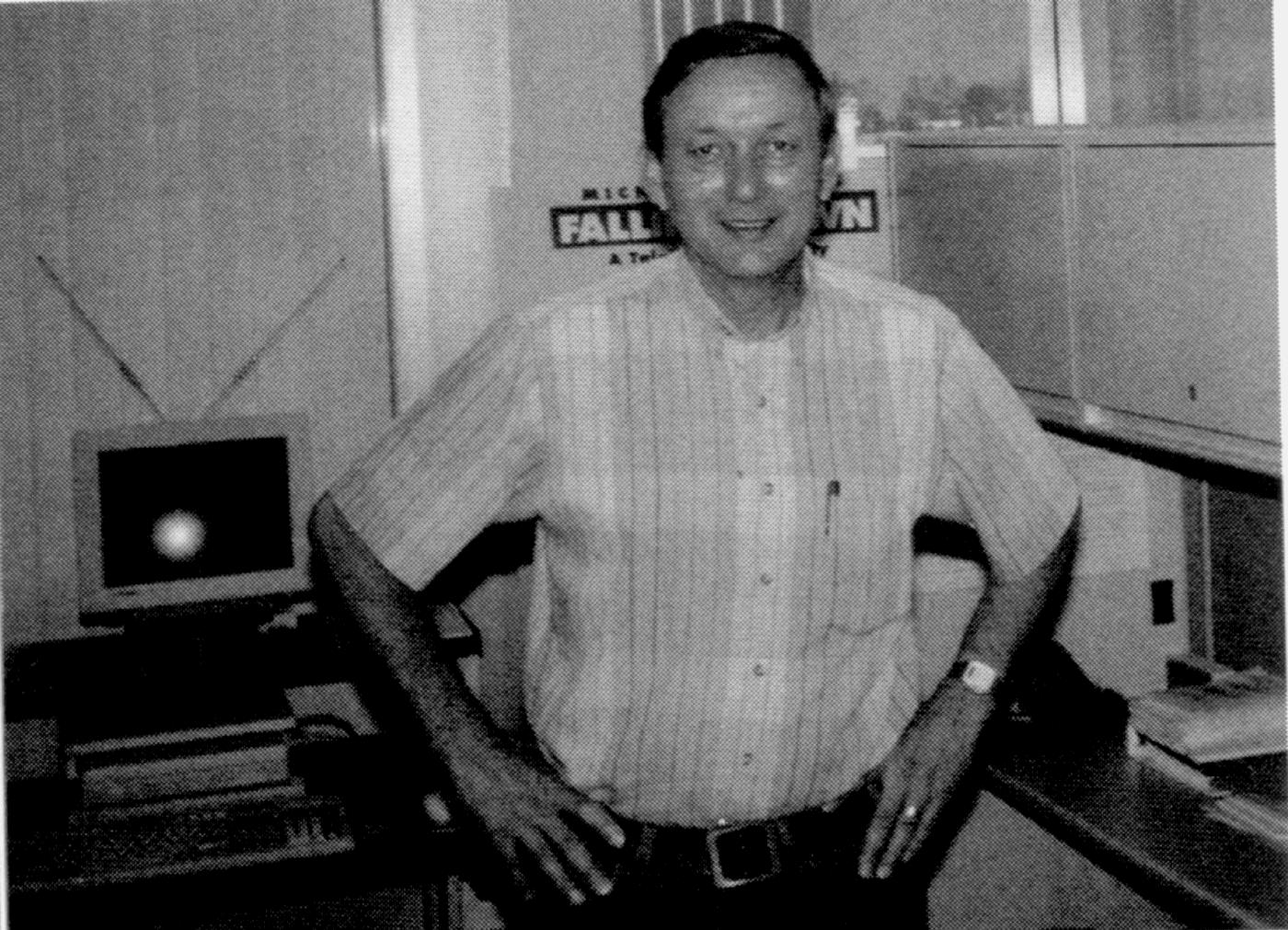 | Terry Atchley, the Pacific Bell security investigator, standing before the desk that Kevin broke into while he was on the run from the FBI. |