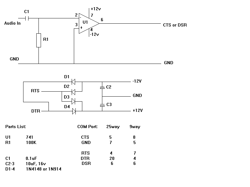Sub-Mini 2.5mm Head Phone socket (RS Part 274-275) 25pin Female Connector (RS Part 276-1548; $6.99 ea) 741 Op Amp (RS Part 276-0007; $2.79ea) 100K Resistor (RS Part 271-1347; $0.89 for 5) Capacitor 0.1uf (RS Part 272-109; $3.19 for 5) Capacitors 10uf 16V (RS Part 272-1025 (35vdc); $1.29ea is acceptable) Diodes 1N4148 or 1N914 (RS Part 276-1122; $2.79 for 10) 8pin DIP IC socket (optional) (RS Part 276-1995; $1.29 for 2) Non-Conducting Perfboard (with holes spaced so the legs of the 741 will fit)