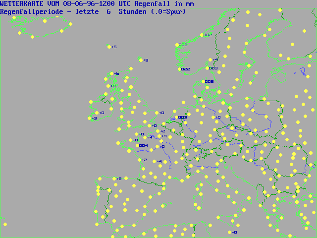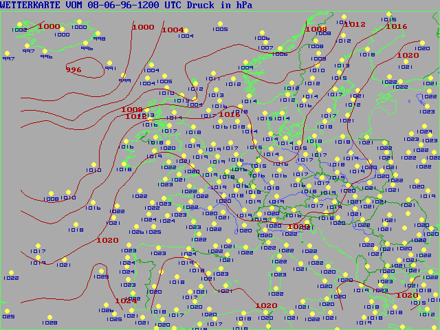Here are some example maps from Europe, Sunday 08-06-96 1200 UTC (a "tropical" day here in Germany) represents reports FM 13 (Ships) and FM 11 (Land Stations) plotted with the German version Supra PC SYNOP 5.2: