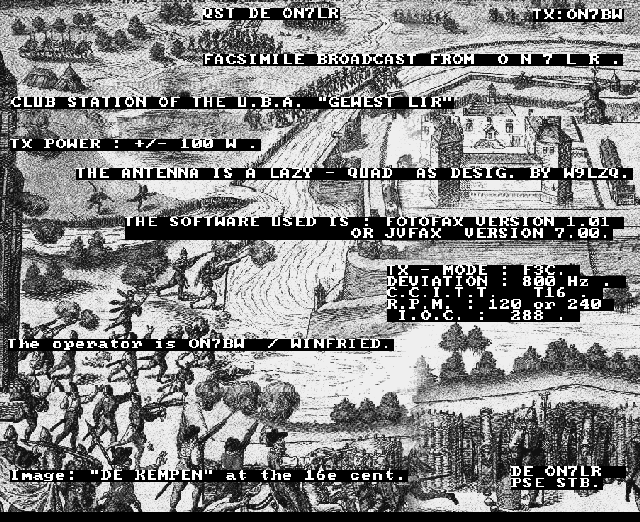The transmissions contain usefull information about FAX/SSTV/HELL as well as pictures of the City of Lier, Belgium.