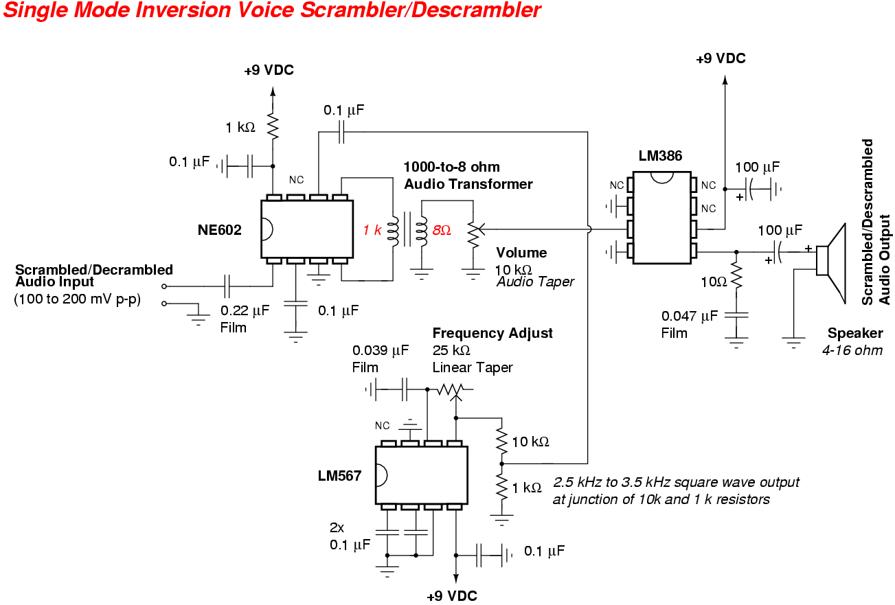 Can also be used to scramble radio communications. Connect between the microphone input and speaker output of your radios or the audio input of your surveillance bug. Will only provide some degree of security to casual eavesdropping, as this method is fairly easy to defeat.