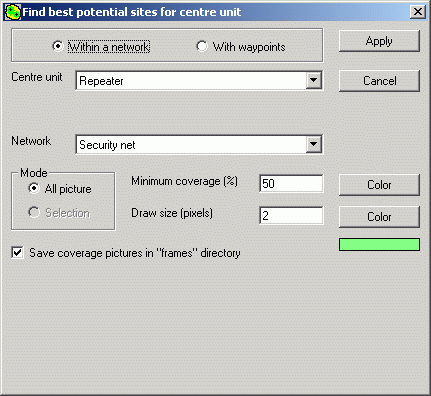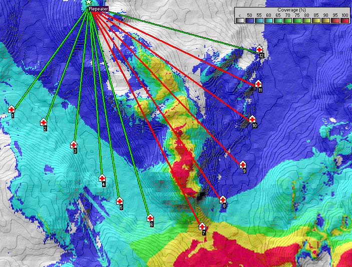 6-The repeater can be placed at the previous location and we observe again that 7 of the 12 sites are covered from there.