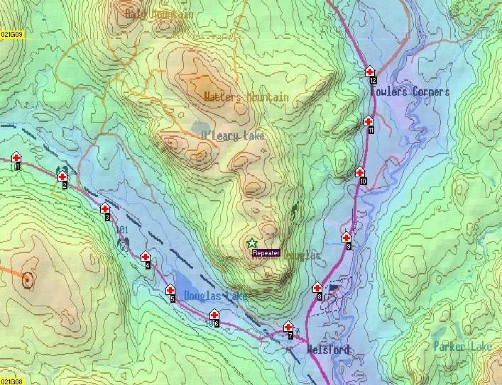 Note that the suggested mountain top location for the repeater is ideal for radio aspect, but that the fact that there is no road to get there makes that solution impractical. So, where should we put the repeater to insure good communications?