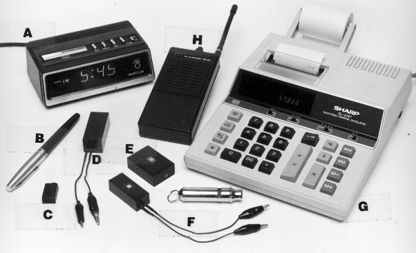 G. Desktop adding machine with built in wireless bugging device...since this unit is a little larger...you can add a more powerful transmitter...and monitor all the room conversation from a greater distance away...again, this unit is powered by the existing AC power line and needs no battery change...theoretically, once installed, it's there forever...