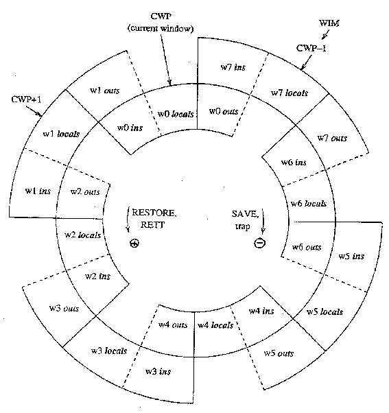 The overlap of the registers is illustrated in figure 1. The figure shows an implementation with 8 windows, numbered 0 to 7 (labeled w0 to w7 in the figure).. Each window corresponds to 24 registers, 16 of which are shared with "neighboring" windows. The windows are arranged in a wrap-around manner, thus window number 0 borders window number 7. The common cause of changing the current window, as pointed to by CWP, is the RESTORE and SAVE instuctions, shown in the middle. Less common is the supervisor RETT instruction (return from trap) and the trap event (interrupt, exception, or TRAP instruction).