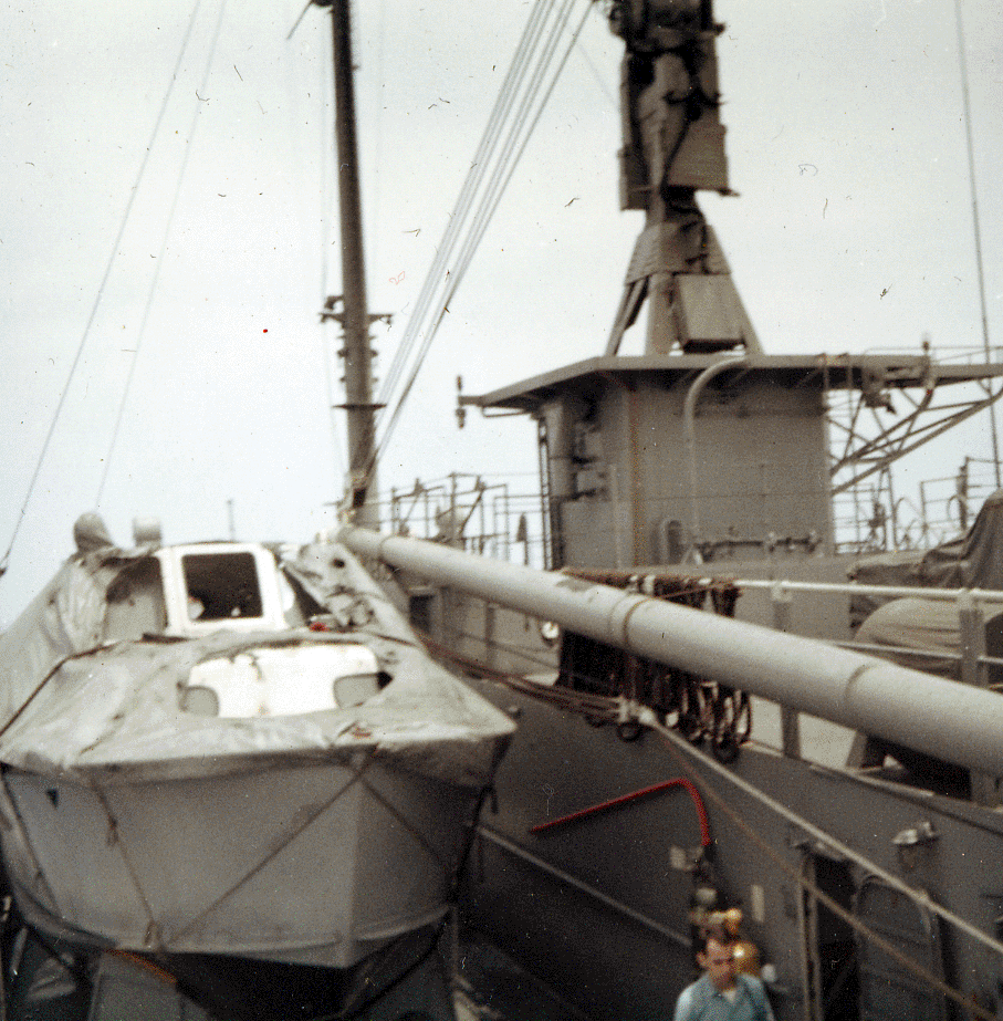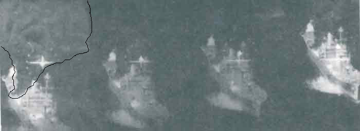 They even faked the smoke in their fake "gun camera" pictures. The "gun camera" photos reveal thick black smoke (highlighted here) coming from a fire on the main deck, starboard side, in the area of the captain's gig (boat) and obscuring the TRSSCOMM Moon Bounce antenna. According to men who were in that area at the time, and verified by photography taken soon after the shooting stopped, there were no fires in that area and the photography reveals no smoke or fire damage. Even if there had been a smoky fire in that area, the wind was from dead ahead and smoke would have drifted astern, not from left to right and then astern as falsely depicted here. Smoke and fire damage would be visible in the lower picture, the gig would be damaged, and certainly the TRSSCOMM antenna would be blackened from the smoke.