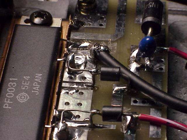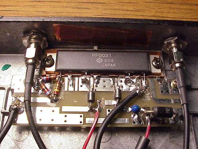 The beast. The PF0031 based power amplifier. I say it's only 6 watts, but in reality, it'll do 10 watts easy. Note, however, in the following pictures you'll need to perform some serious RF engineering skillz, otherwise the amplifier will oscillate, probably destructively (AKA, blow up). I salvaged the heatsink and copper heat spreader from and old Nokia cellular phone. I suggest you try to do the same. The PC board the amplifier is mounted to was bought surplus from Down East Microwave, #CL11. This isn't the right PC board, so it will need some modifications to fit the module. The PF0031 module is available from RF Parts.