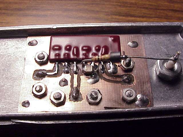 Closeup of the RF input side and the 20 dB attenuator. Should probably use surface mount resistors in the attenuator pad, but they won't handle the fairly high RF input power. You can also see how the circuit board was cut to isolate the Vapc line.