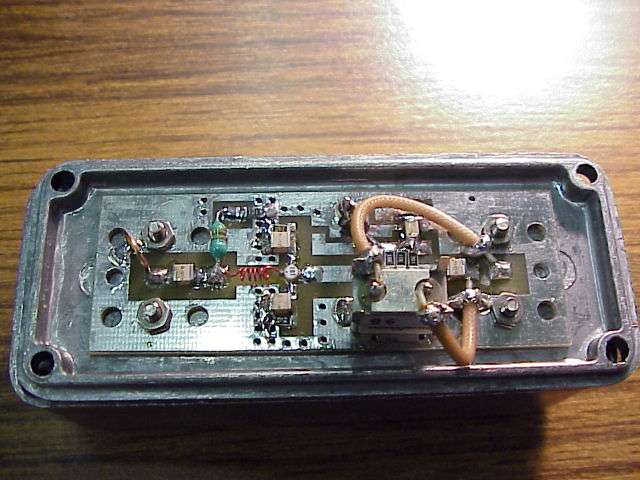 You can see the bias resistor and ferrite bead floating in the air. The bias line passes through a regular feed-through (non-capacitor). RF connectors are SMA, with the teflon covered pin (ala the 33LNACK), the connectors are also available from Down East Microwave.
