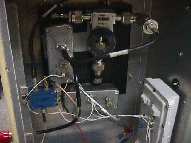 Picture of the transmit/receive control logic boards and the voltage regulators. Once again, housed in an old California Amplifier MMDS downconverter case. +15 VDC comes in through the top via a 1000 pF feed-through capacitor. The transmit/receive control logic from the WaveLAN card enters via one of the F connectors on the right side. The +5 VDC on transmit and +9 VDC on receive signals leave the case through standard feed-throughs (non-capacitor).