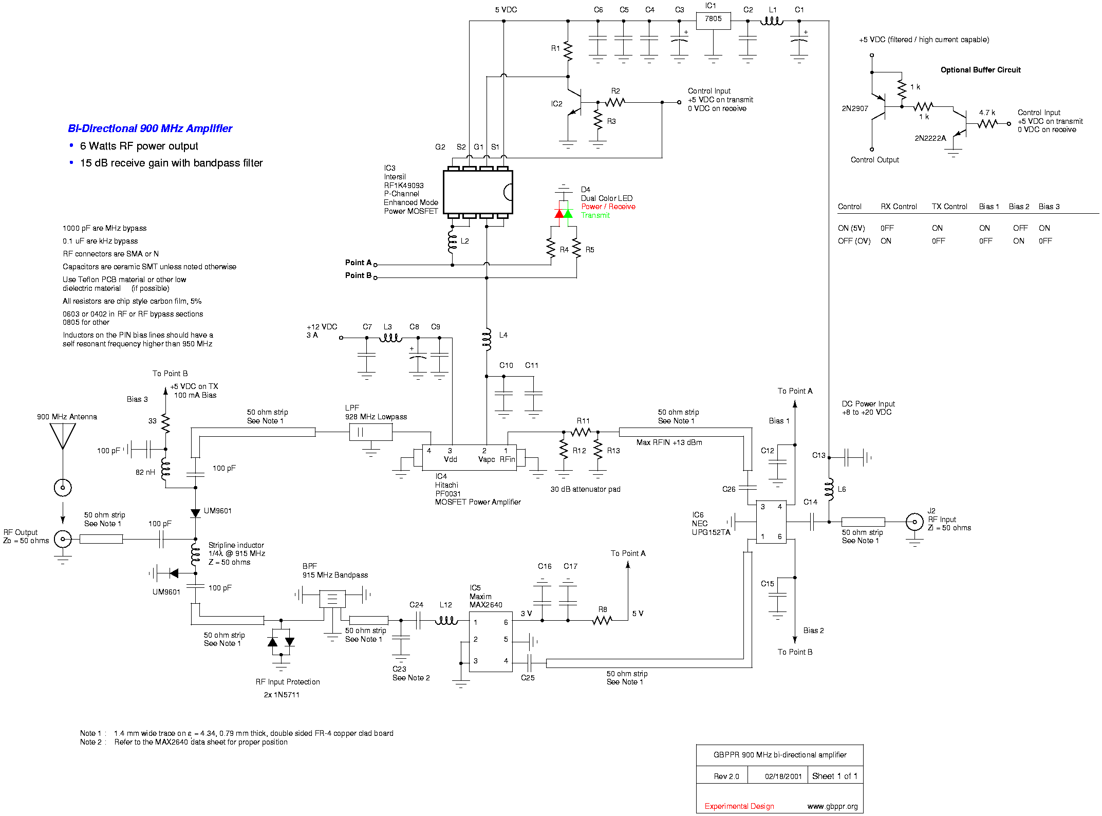 Schematic Reference Value Description Package Supplier Supplier Part Number IC1 7805 5 volt regulator, 1500 mA TO-220 Mouser 511-L7805CV IC2 2N2222A NPN SOT-23 Mouser 592-MMST2222A IC3 RF1K49093 Intersil p-channel enhanced mode power MOSFET SOP-8 Newark 66F3188 IC4 Note 3 PF0031 Hitachi MOSFET cellular phone power amplifier Module RF Parts IC5 MAX2640 Maxim 900 MHz low noise amplifier SOP-8 Free sample IC6 UPG152TA NEC GaAs MMIC SPDT RF switch SOT-26 Digi-Key UPG152TA-ND