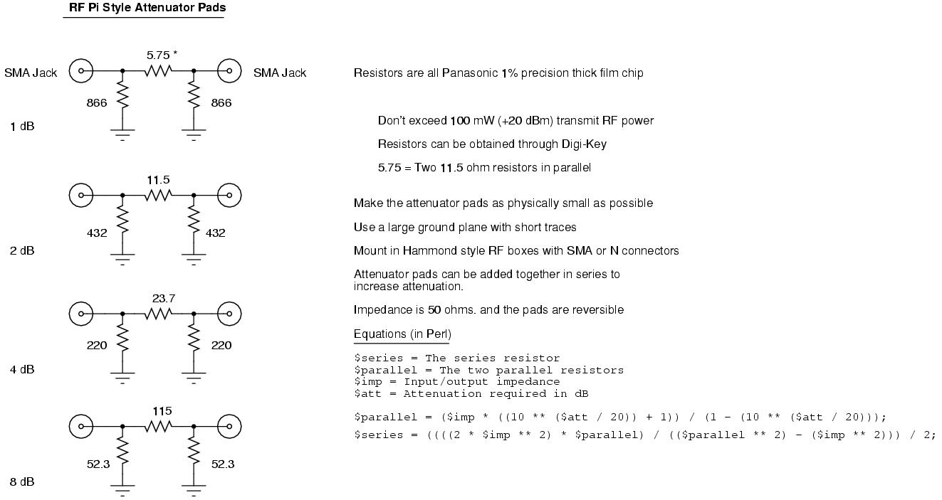 You can also make some attenuator pads to help simulate real life signal loss when testing your wireless network links. If you wish, you can order commercial inline attenuators from Mini-Circuits that will handle 2 Watts of power, DC - 18 GHz, and have built in SMA connectors for around $37 a piece. You may also combine attenuator pads to increase the overall attenuation. It's also possible to use a long length of high-loss cable, such as RG-174, as an attenuator.