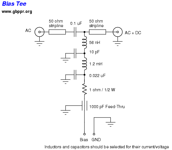 This version has an input/output impedance of 50 Ohms and should have a low insertion loss from 5 kHz to 3 GHz. The maximum DC voltage and currents ratings will vary with components used (50 V / 500 mA typical). Keep the RF input power under 2 Watts.