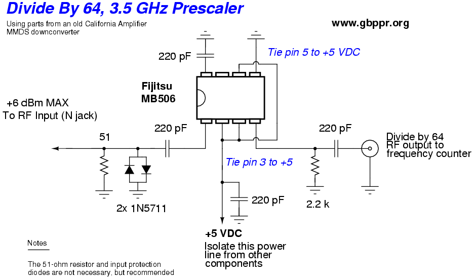 This will take a 0.1 - 3.5 GHz signal and divide it by 1000 so you can measure frequencies outside the normal range of your frequency counter. Example, a 2450 MHz signal will read 2.450 MHz on your counter. This is from the July 20, 2000 issue of EDN magazine and I made a few modifications.